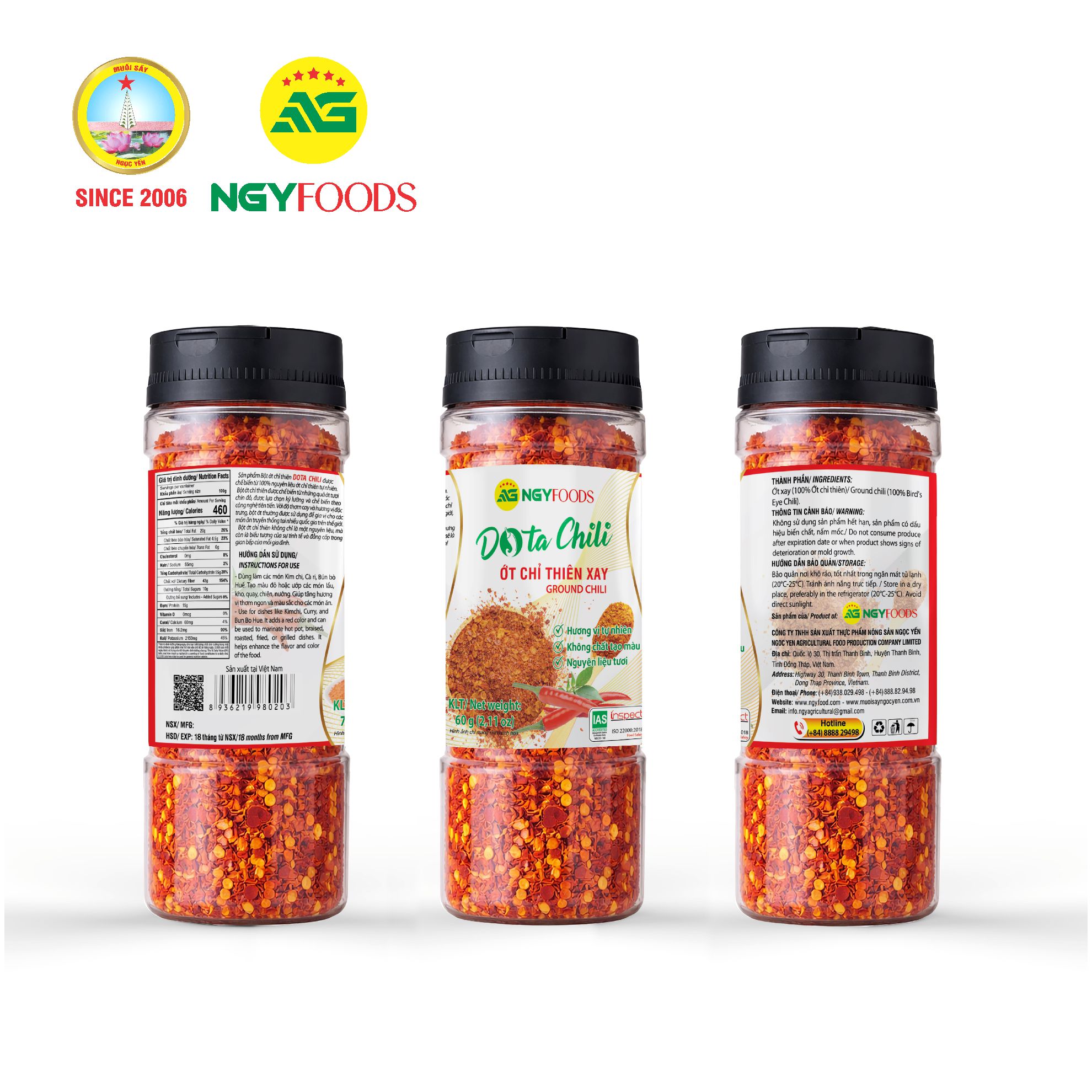 Ớt Chỉ Thiên Xay DOTA CHILI (NGYFOODS) là ớt xay dạng hạt/miếng nhỏ, cay nồng đúng chất ớt chỉ thiên, màu đỏ đẹp và mùi thơm tự nhiên, giúp món ăn dậy vị – lên màu – kích thích vị giác ngay khi nêm. Sản phẩm tiện dụng cho bếp gia đình và quán ăn: chỉ cần rắc hoặc cho một lượng nhỏ là món bún bò, phở, mì, lẩu, các món xào – kho – nướng trở nên đậm đà hơn. Đóng hũ 60g gọn nhẹ, nắp chắc, dễ dùng và dễ bảo quản.